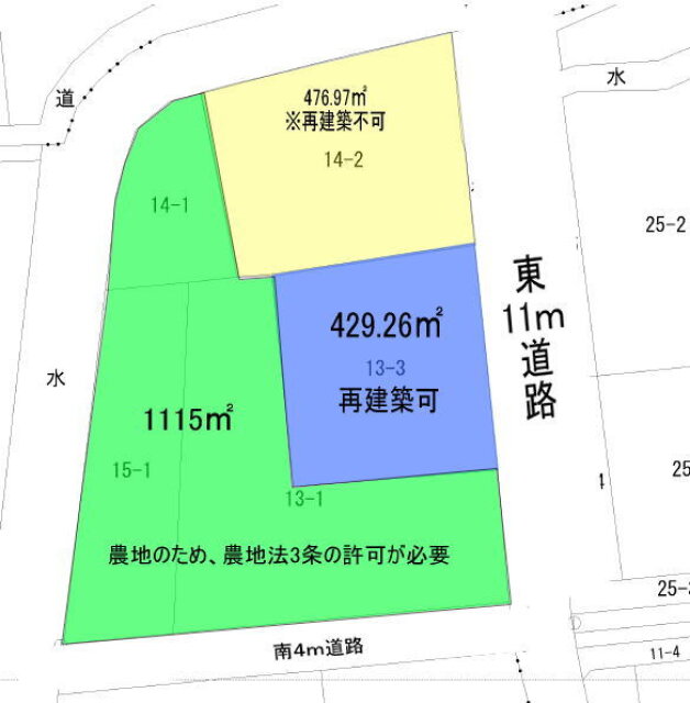 備考 | ●建物2棟あり。 南側の建物が敷地部分は建替え可(法以前要件) 北側の建物は、再建築要件に合致しないため、再建築不可。 ●現状渡し ●水道引込なし。全面道路に水道引込みが無いため、離れた所より引込要。 | ||